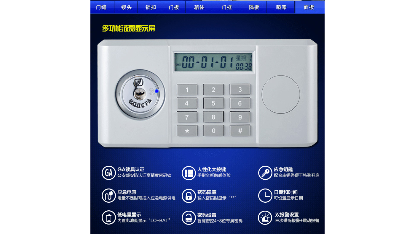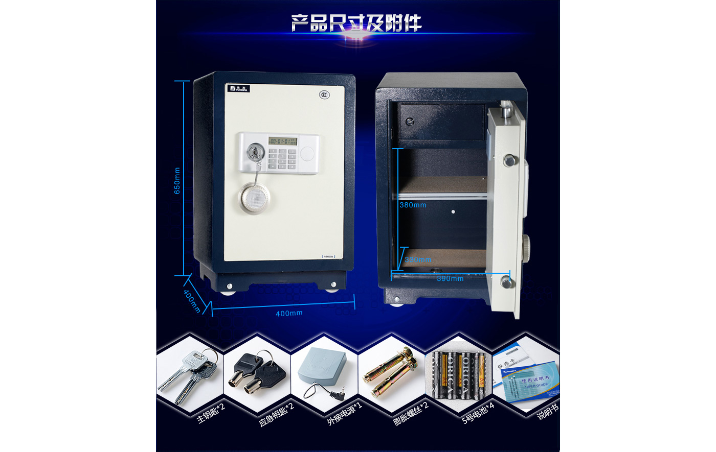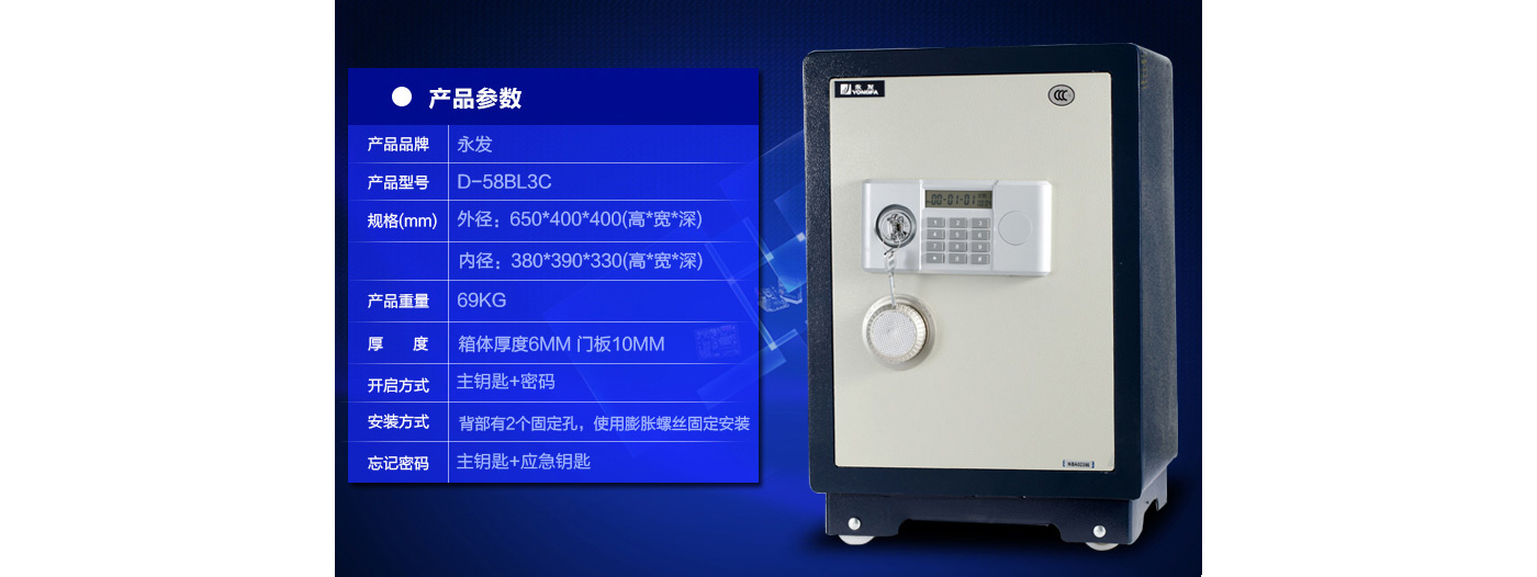 永發經典電子系列3C認證保險箱D-58BL3C尺寸說明:650高*400寬*400深mm(含底座) 重量:69kg