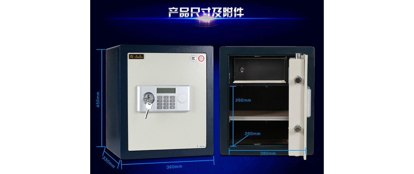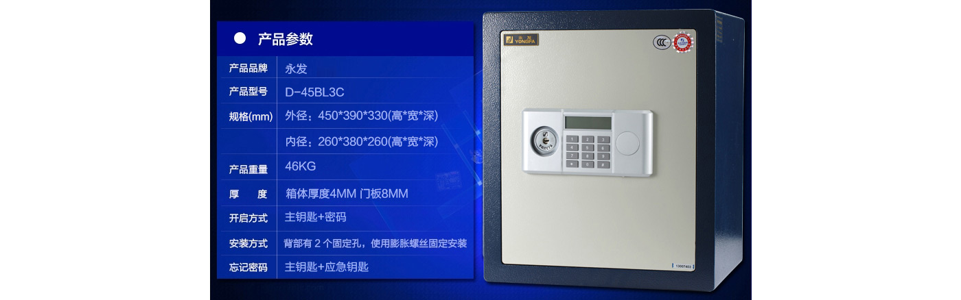 永發(fā)經(jīng)典電子系列3C認(rèn)證保險箱D-45BL3C尺寸說明:450高*390寬*330深mm 重量:46kg