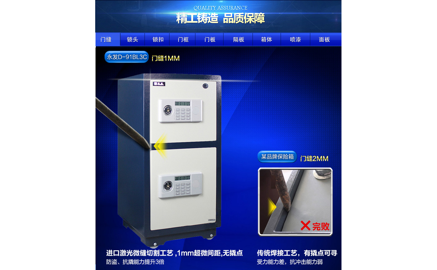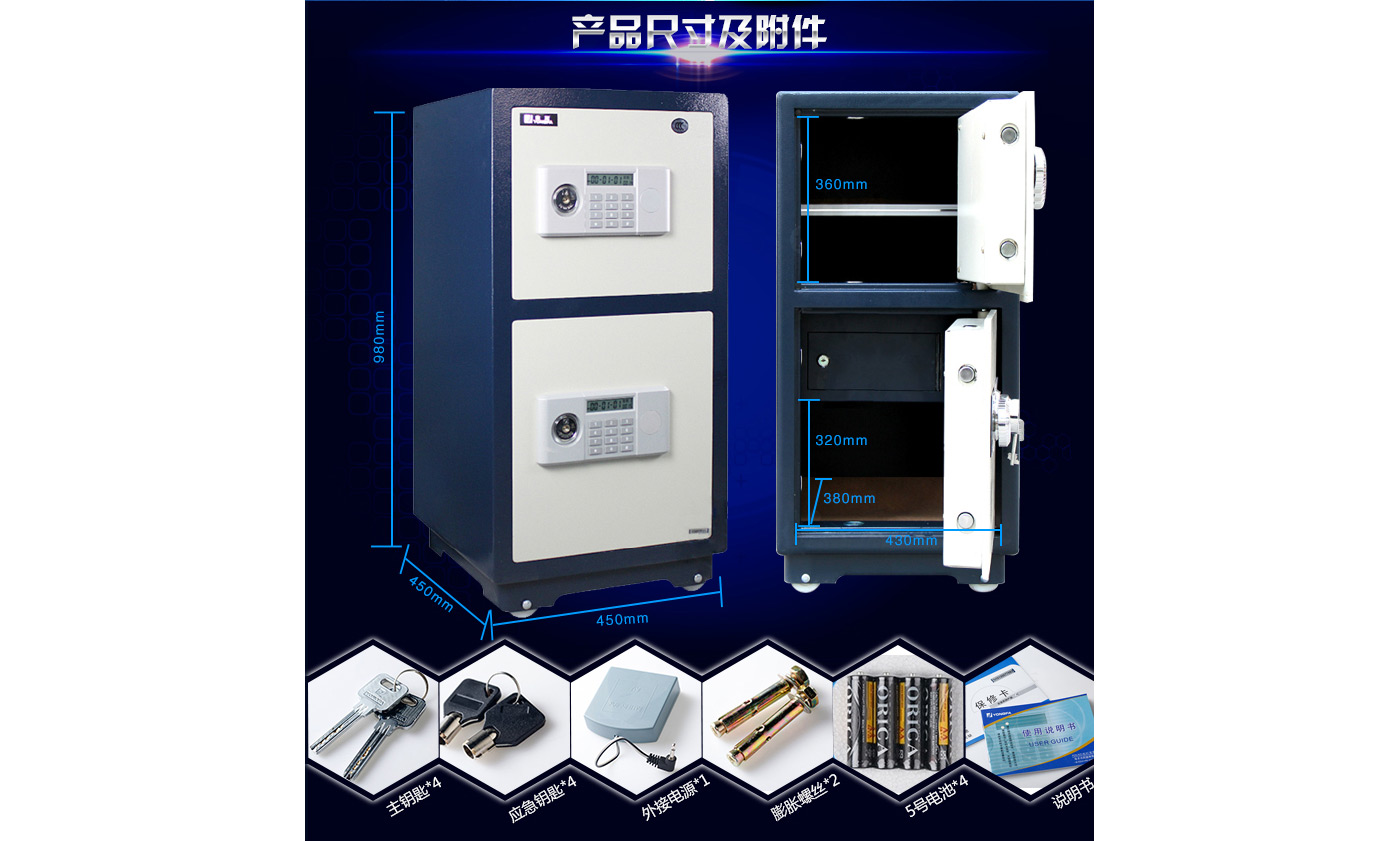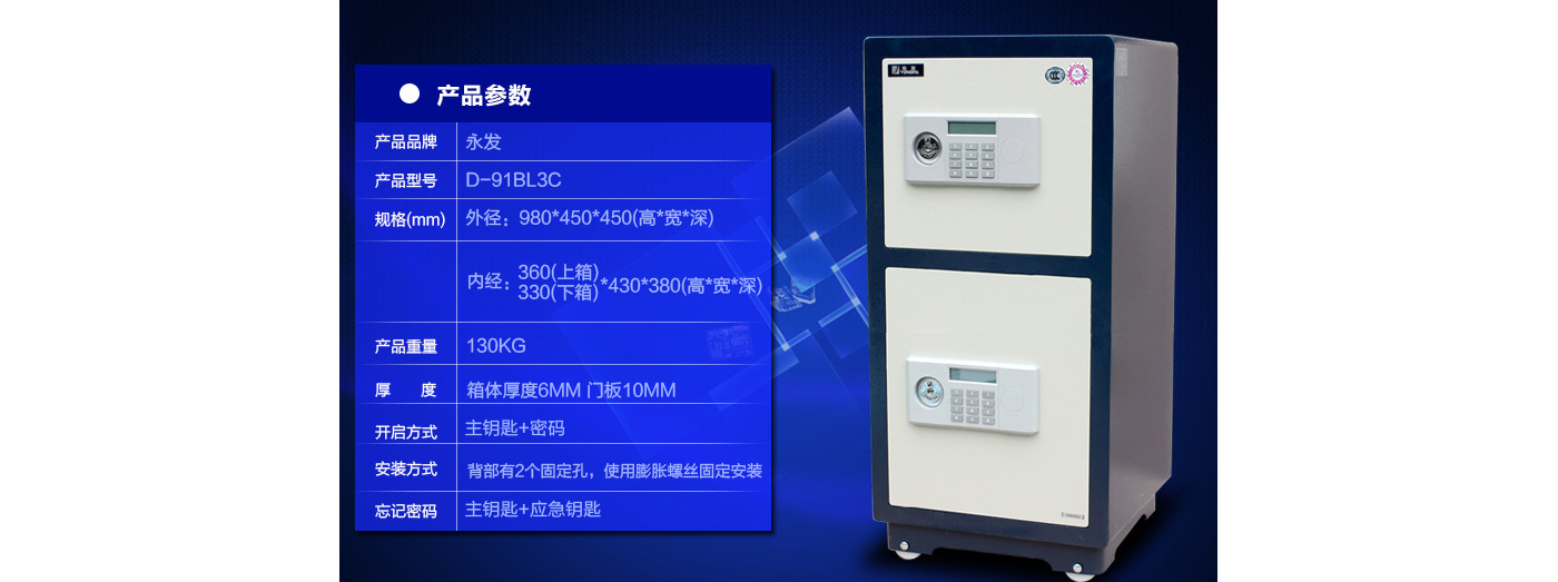 永發經典電子系列3C認證保險箱D-91BL3C/d尺寸說明:980高*450寬*450深mm(含底座) 重量:129kg