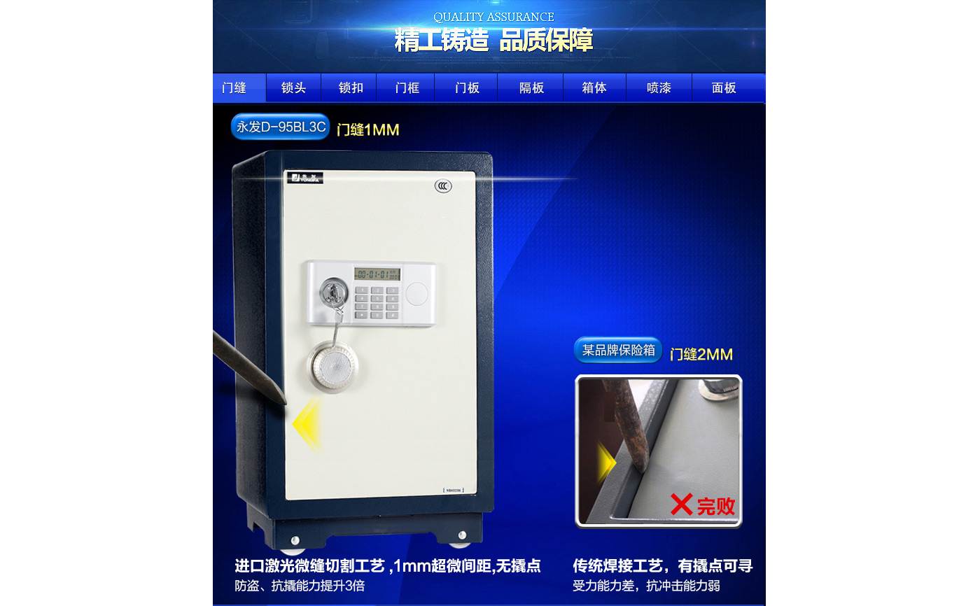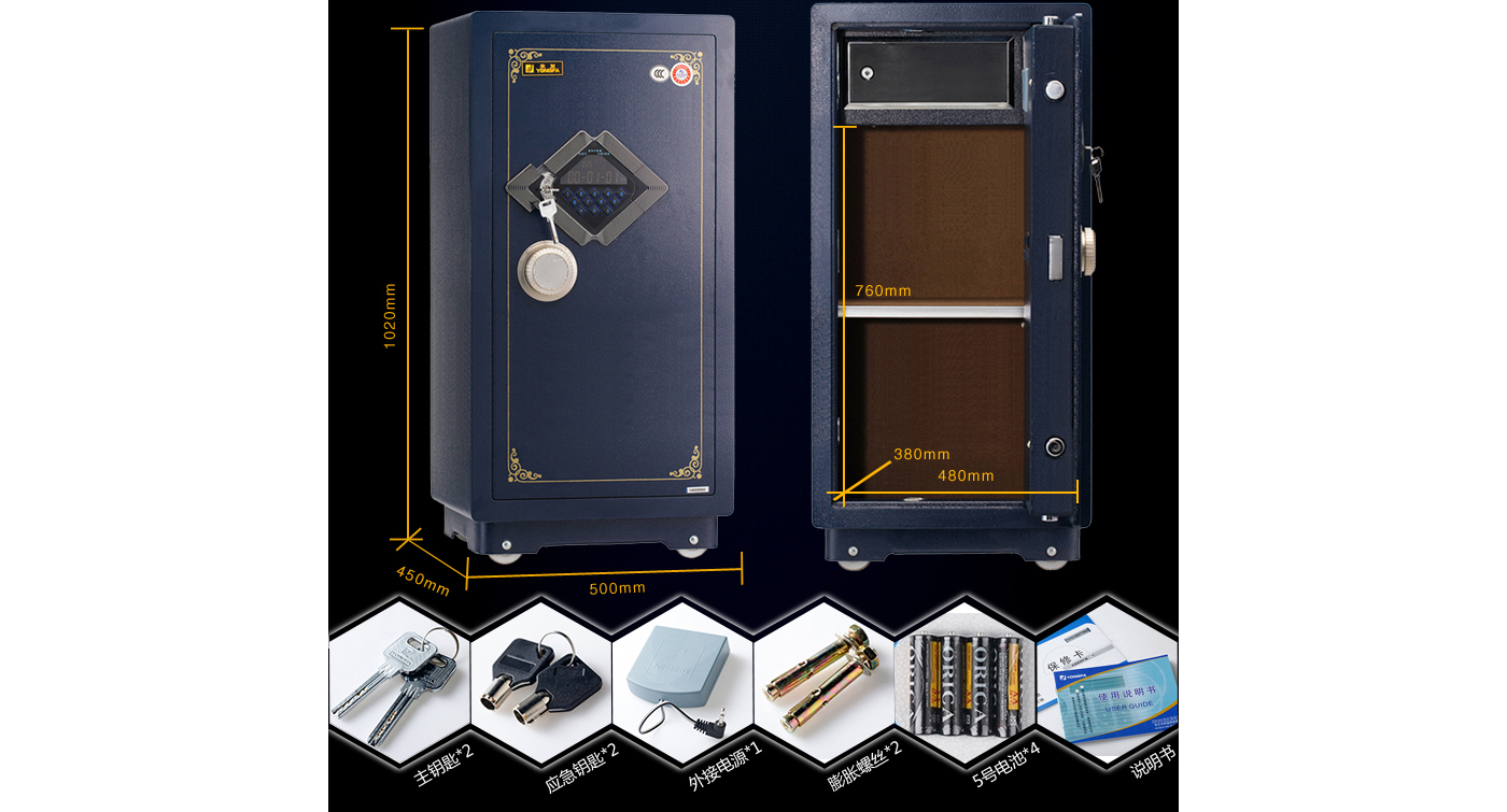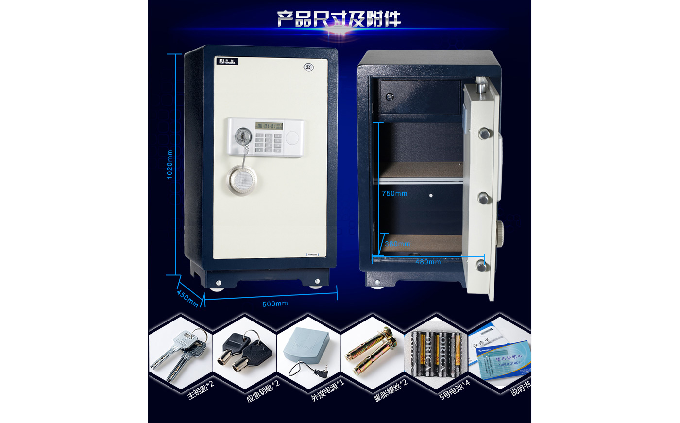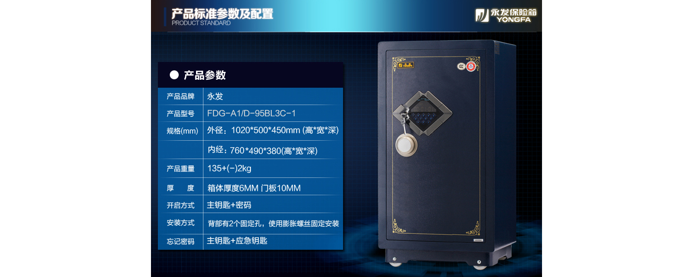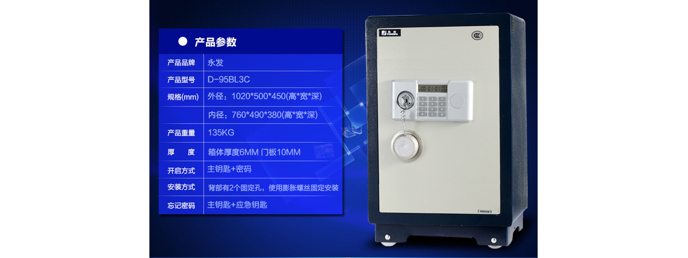 永發經典電子系列3C認證保險箱D-95BL3C尺寸說明:1020高*500寬*450深mm(含底座) 重量:135kg