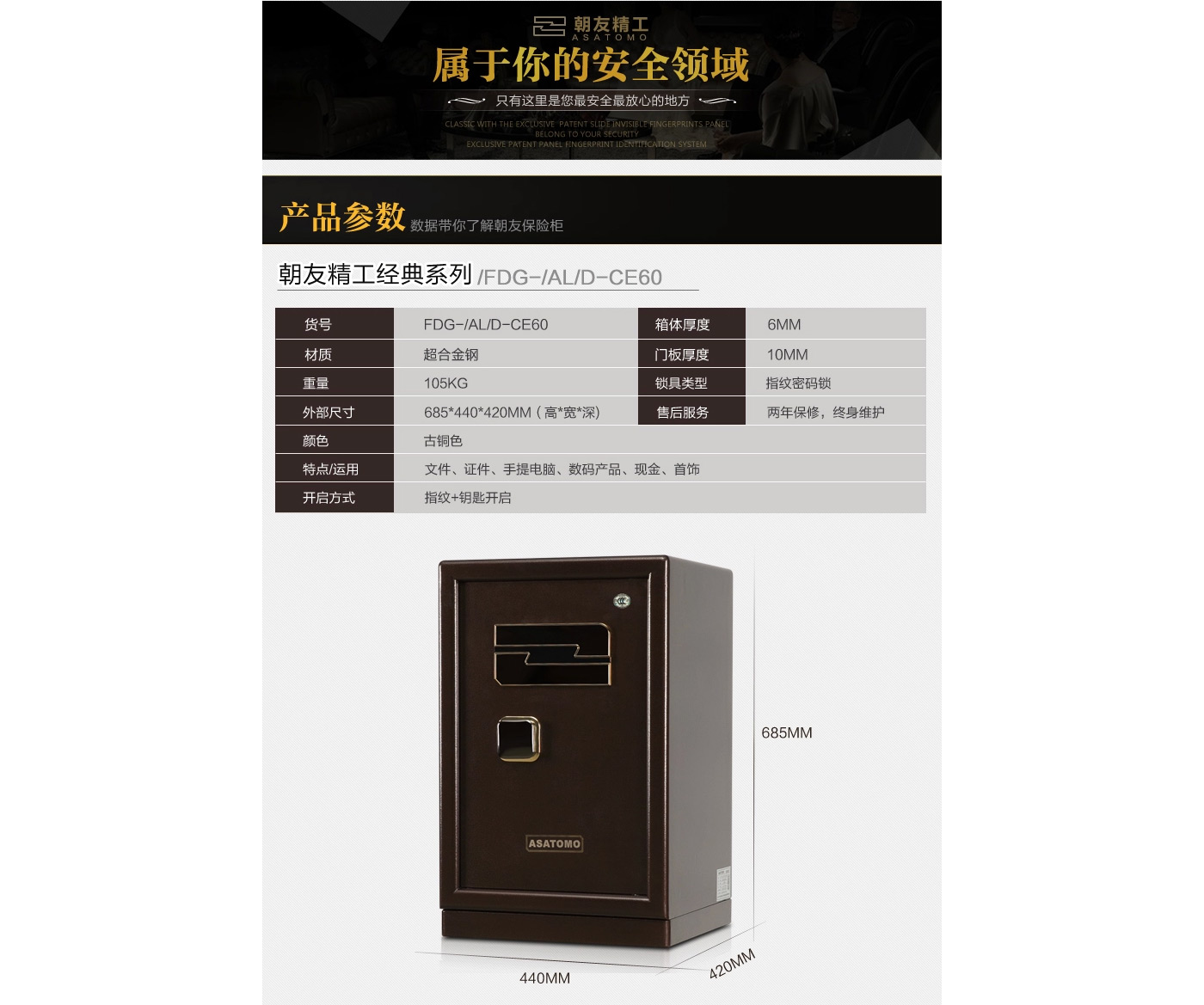 永發旗下朝友CE60經典指紋3C保險柜尺寸說明:685高*440寬*420深mm(含底座) 重量:105kg