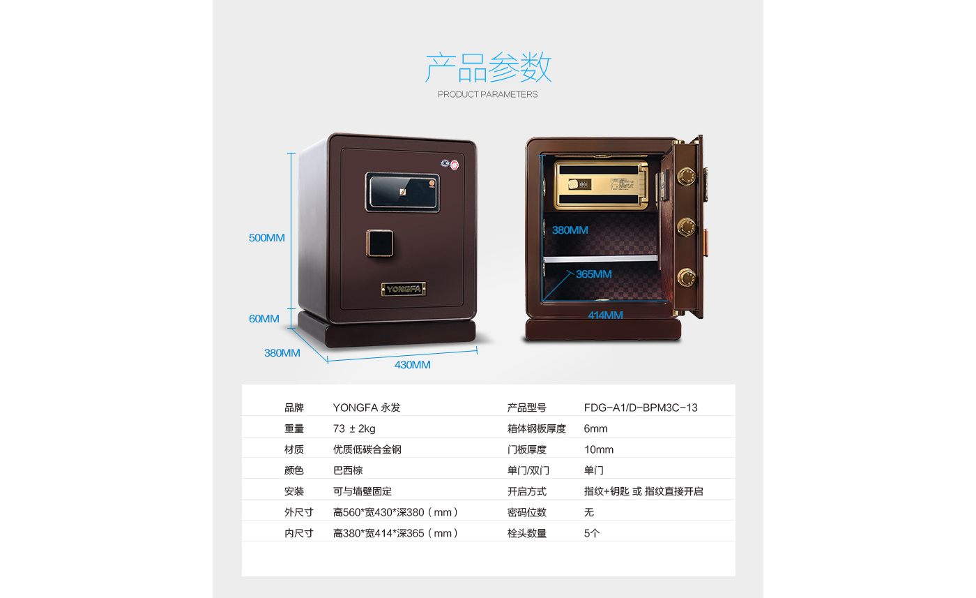 永發尚瑞系列指紋式3C保險柜50BPM3C-13尺寸說明:560高*430寬*380深mm(含底座) 重量:73kg