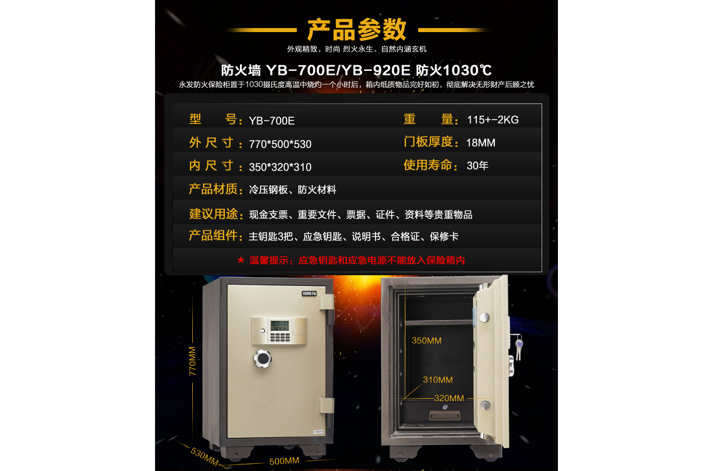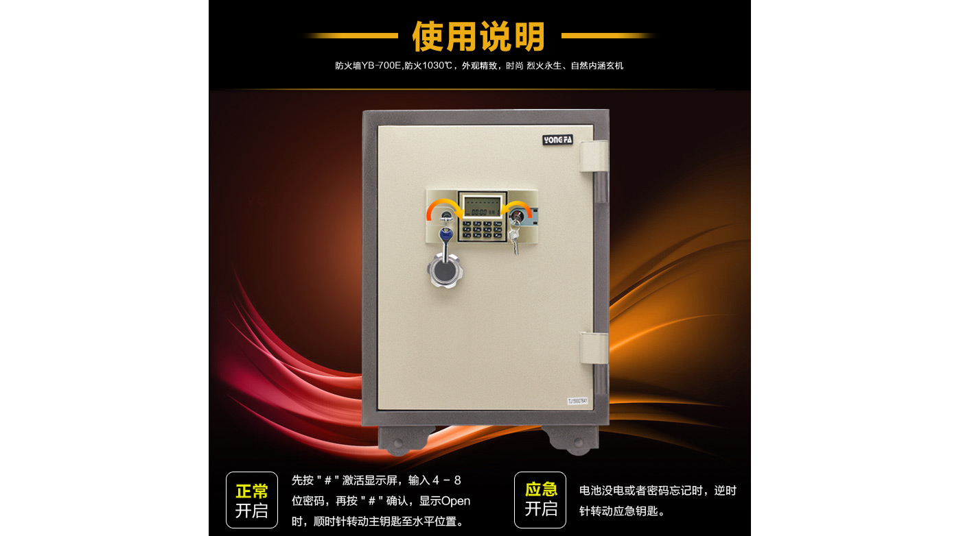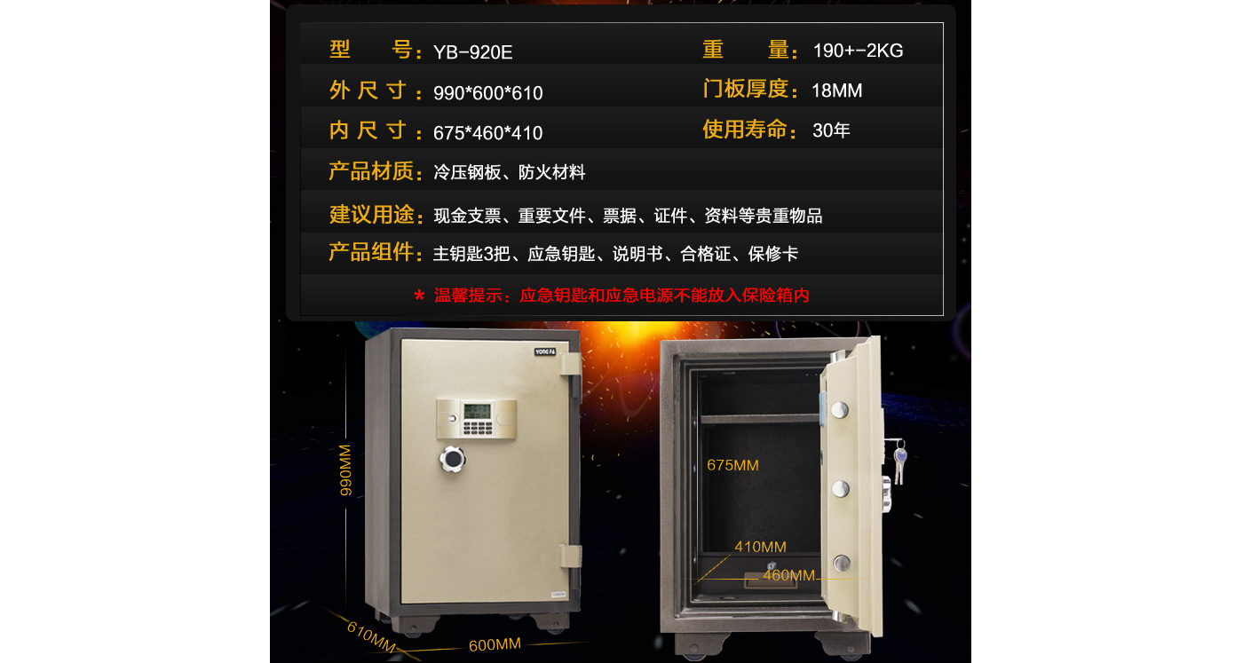 永發電子防火柜YB-700E尺寸說明:770高*500寬*530深mm(含底座) 重量:115kg