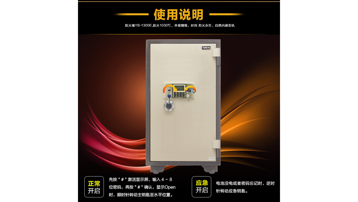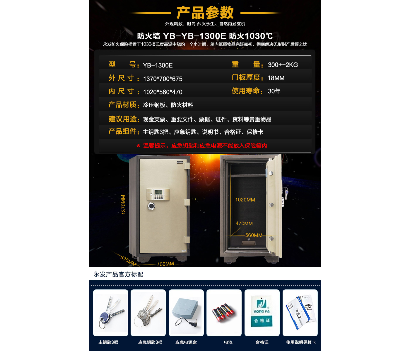 永發電子防火柜YB-1300E尺寸說明:1370高*700寬*675深mm(含底座) 重量:300kg