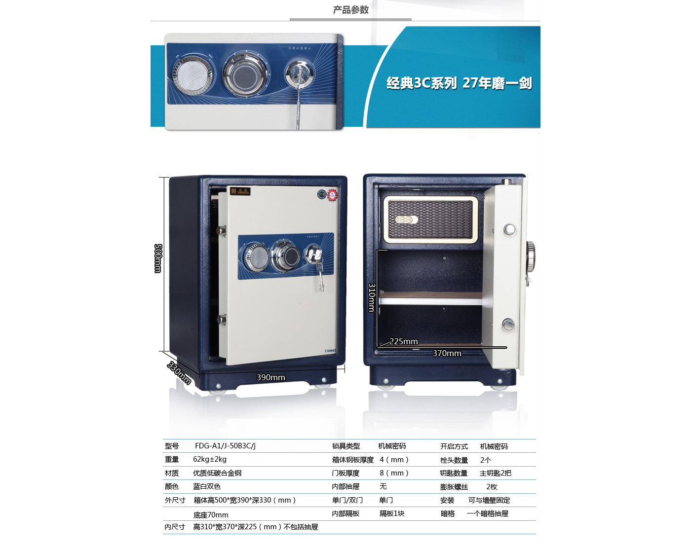 永發(fā)經(jīng)典機械系列3C認(rèn)證保險箱J-50B3C尺寸說明:570高*390寬*330深mm(含底座) 重量:62kg