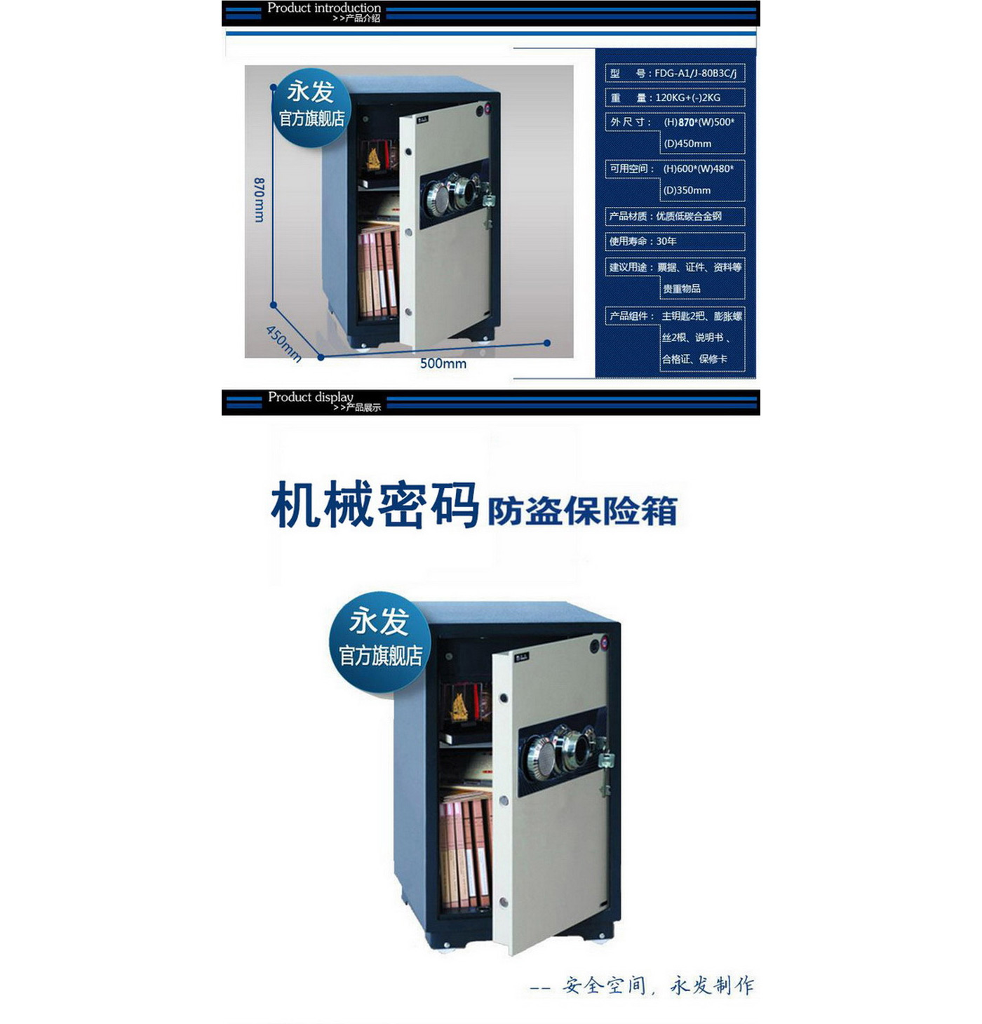 永發經典機械系列3C認證保險箱J-80B3C尺寸說明:870高*500寬*450深mm(含底座) 重量:120kg