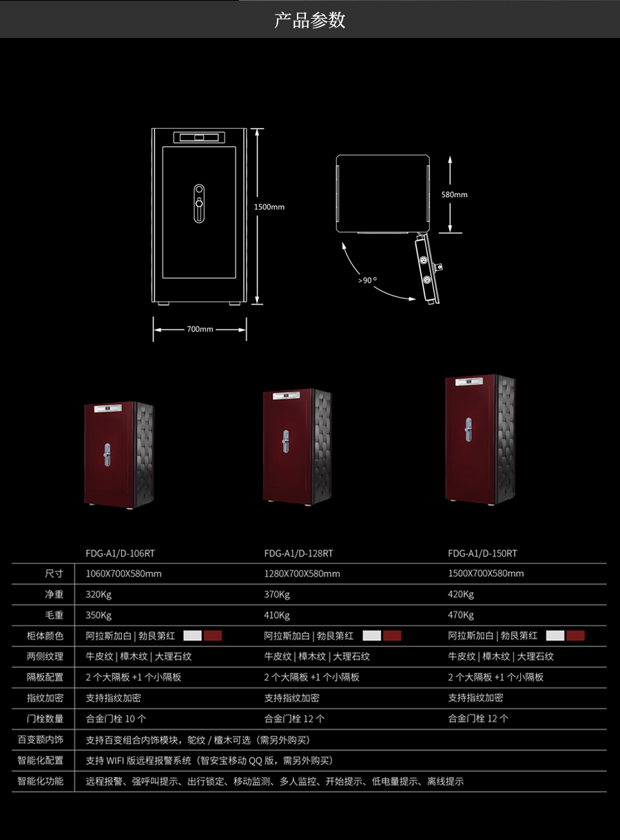 卡嘜御寶系列頂級3C認證保險箱D-106RT尺寸說明:1060高*700寬*580深mm(含底座) 重量:320kg